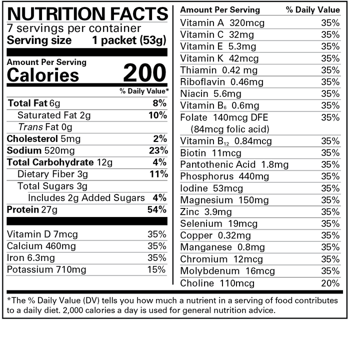 Whey Protein Isolate, Micellar Casein, Cocoa (Processed with Alkali), Milk Protein Isolate, Maltodextrin, Natural and Artificial Flavor, Sunflower Oil, Resistant Maltodextrin (Dietary Fiber), Medium Chain Triglycerides, Nonfat Milk, Flaxseed, Salt, Isomaltulose, Corn Oil, Sodium Citrate, Soy Lecithin, Corn Syrup Solids, Modified Starch, Sodium Caseinate, Sunflower Lecithin, Xanthan Gum, Sucralose, Mono and Diglycerides, Tocopherols (To Protect Flavor), Acesulfame-K, BHT and Propyl Gallate (To Protect Flavor).